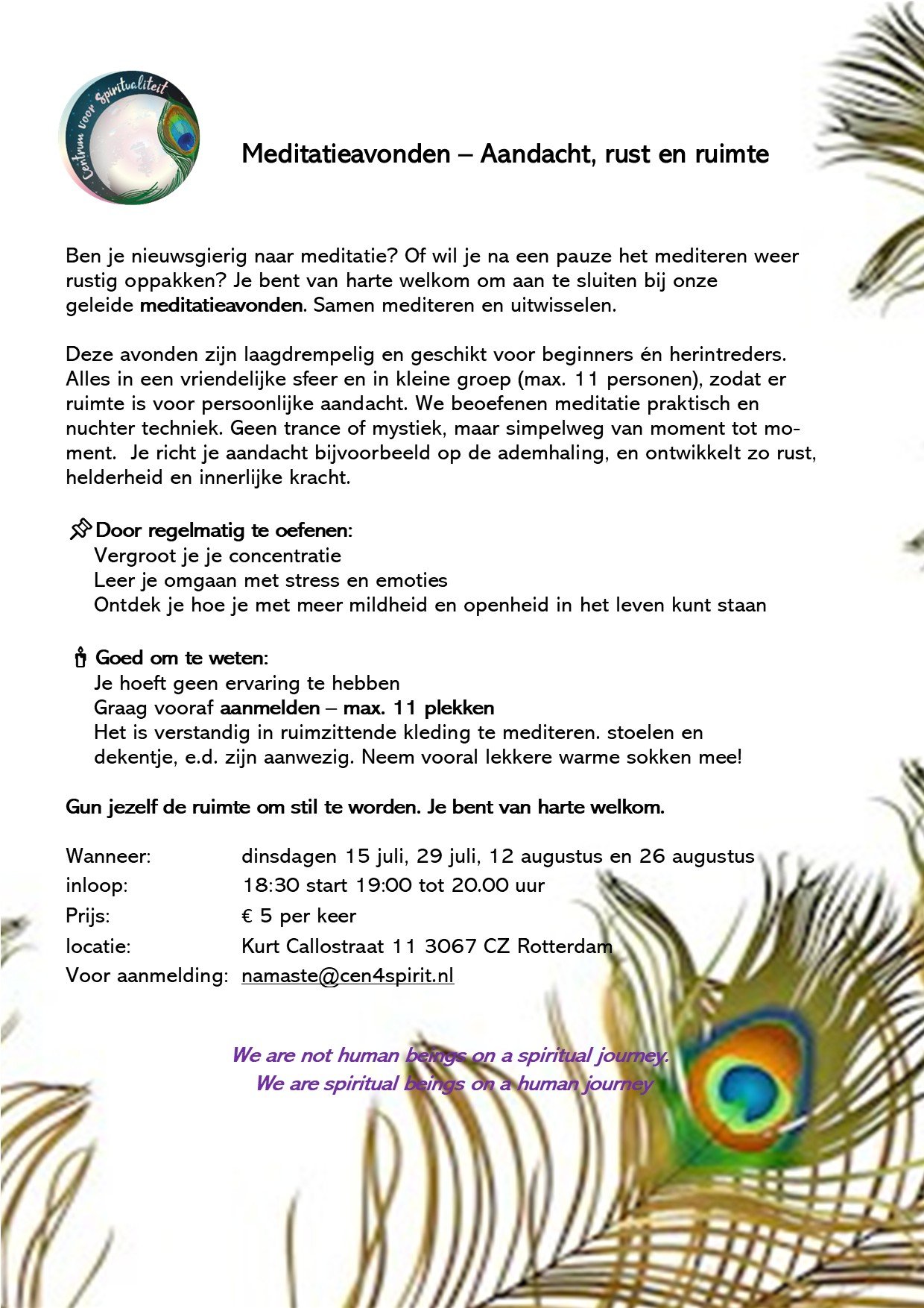 Kom tot rust tijdens onze wekelijkse meditatieavonden. In een warme, veilige setting begeleiden we je naar een dieper contact met jezelf en het moment. Ervaring is niet nodig — iedereen is welkom. Laat je meevoeren door stilte, ademhaling en bewustzijn.